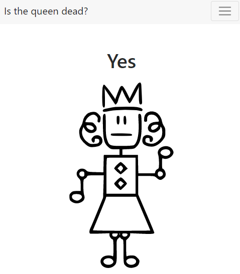 https://isthequeendead.uk paid homage to this website by posing the question “Is the queen dead?” and answering “Probably”, followed by a “My Family” style doodle depicting the queen as a robot (a reference to the historic joke that the queen’s mother had lived so long she’d probably been replaced by a robot). Following the queen’s death, the site was updated to answer “Yes”.