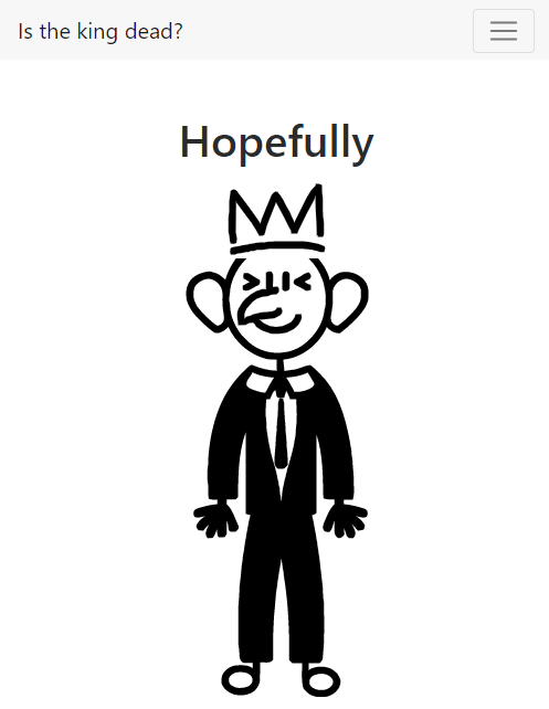 https://isthekingdead.uk continues the tradition of parody by drawing on increasing anti-monarchy rhetoric and answering the question “is the king dead?” with the answer “Hopefully”, depicting the king with a big-eared sausage-fingered caricature in the same style as before.